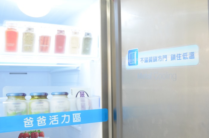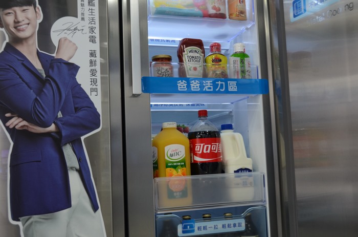 雖然在冰箱中的擺放都是隨個人習慣而自訂,但三星官方將陳列架畫分出烹飪區、活力區與兒童區。其實以一般習慣使用方式,都會將醬料放在陳列架的最上方冷藏,以方便拿取使用;而中間的活力區則放入飲料,這也是最容易拿取的區域;而底下的兒童區可放入小朋友可自行拿取的食物或是飲料,最方便小朋友取用。這樣的規劃可讓最常在冰箱中取用的物品至於陳列架上,而僅開啟靈活愛現門,可避免冷藏室的溫度在冰箱開啟時大量提升而有更多電耗,對於冷藏食物來說,也不會因為頻繁開關的溫度變化而變質。