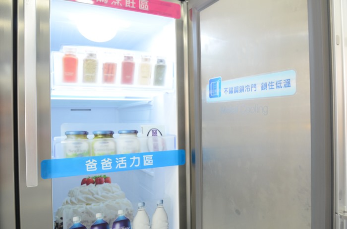 藏鮮愛現門是以雙門對開為主要設計,左方為冷凍室(285公升),右方為冷藏室(515公升),容量相當驚人,這樣的容量作為家中主要的冰箱是非常稱職的。其中有個非常棒的設計,就是在冷藏室有靈活愛現門設計,將原本較不好利用的門側陳列架做最好的設計,這也是Kisplay第一次看到冰箱有兩道門的全新概念的設計,非常特別。