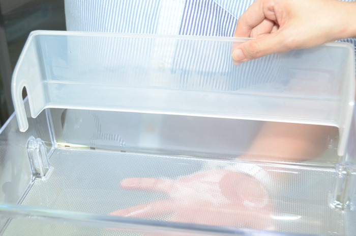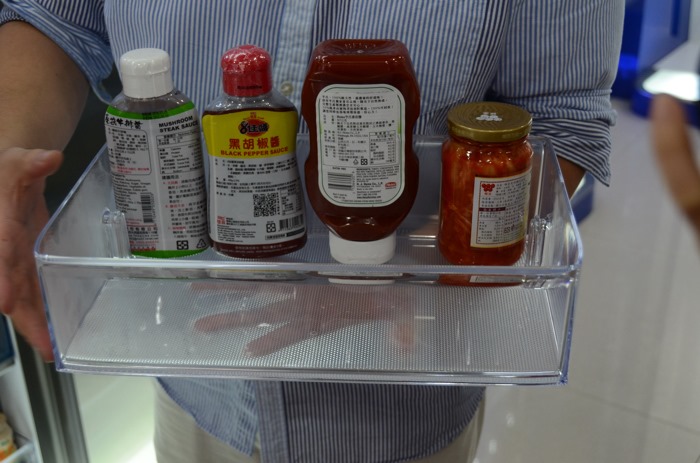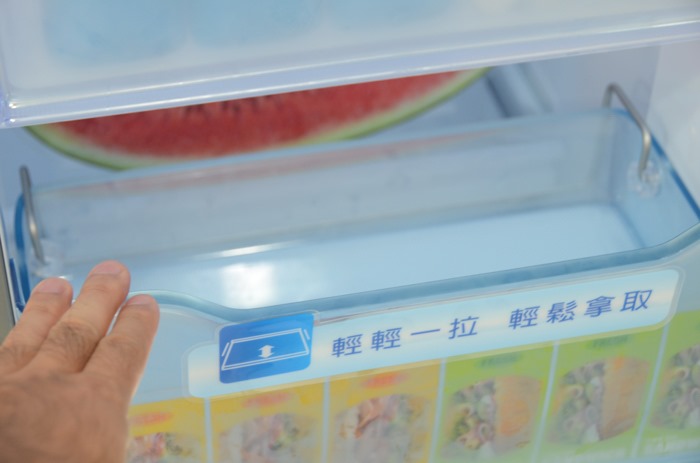 當然太深的陳列架,在關上冰箱門後大家應該可以想像這些瓶瓶罐罐一定會倒掉一片。所以在陳列架中設計了隔板,讓這些瓶罐不至於倒得亂七八糟。
