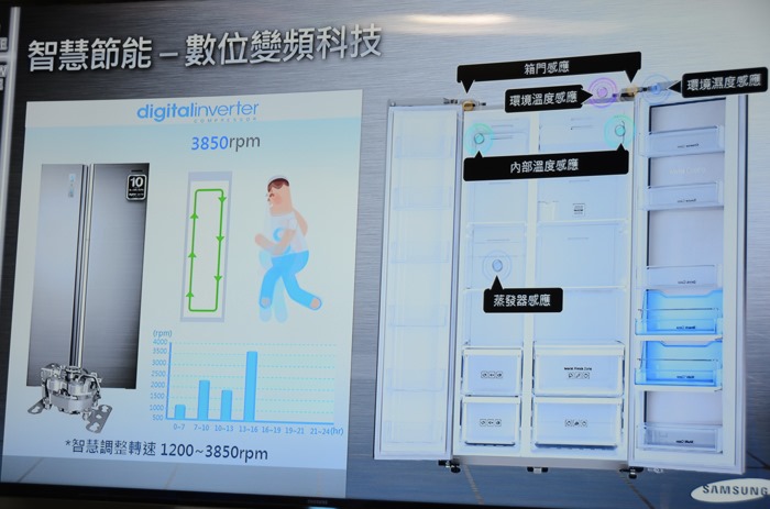 因為有了變頻技術,藏鮮愛現門冰箱也可根據早晚不同的開冰箱頻率做調節,例如中午與傍晚的使用頻率較高,所以會降低溫度;而半夜氣溫較低、而且不常開冰箱,所以溫度部分僅需維持即可。