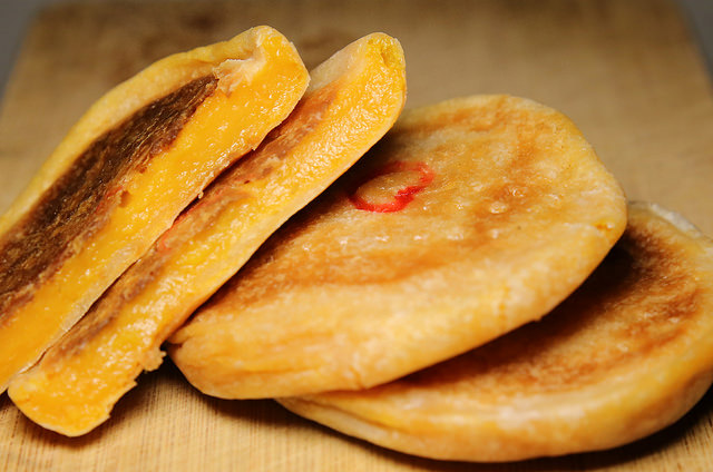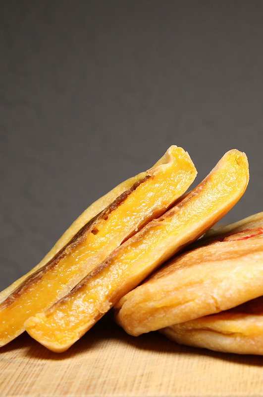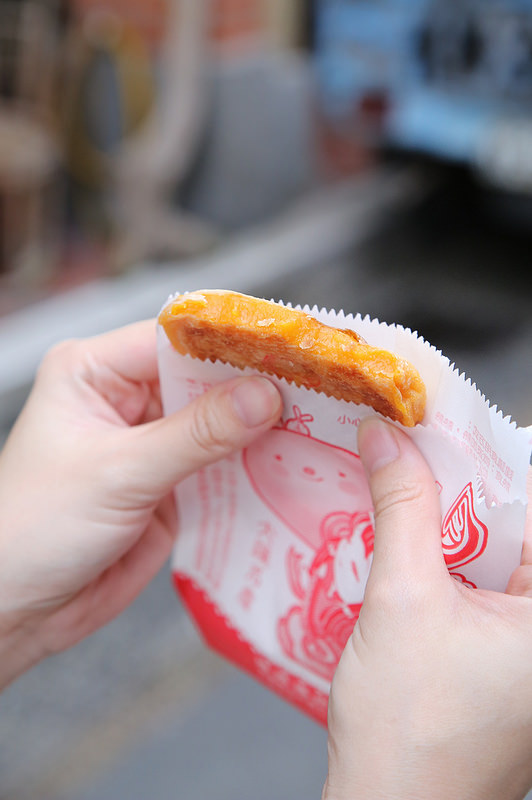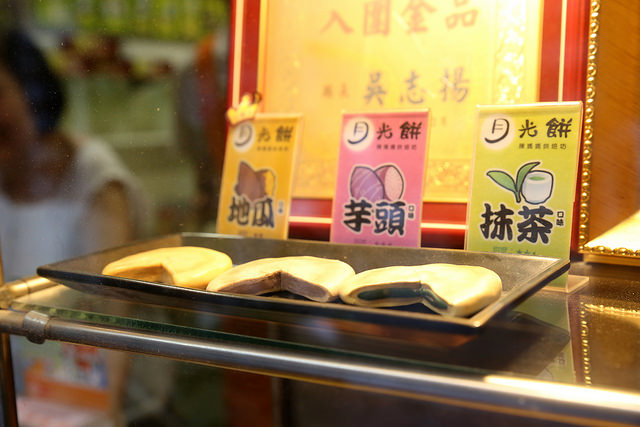 手上這個是地瓜口味的月光餅,地瓜餡不全是軟軟的口感,而是帶著點Q彈,應該是加入糯米粉之類的配料所造成的,非常討喜。甜度也依照一般大眾的接受度來調整,傳統的做法就是加入大量的糖來做保鮮,現在減糖了所以要趕緊吃完。
