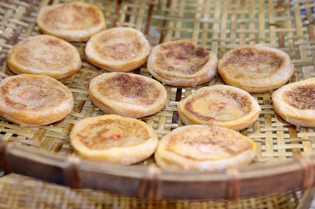 剛做好的月光餅要放在竹篩冷卻上,原本是可以進到店裡面選購,但是有些觀光客會動手去摸正在冷卻的餅,所以現在改成在走廊排隊。
