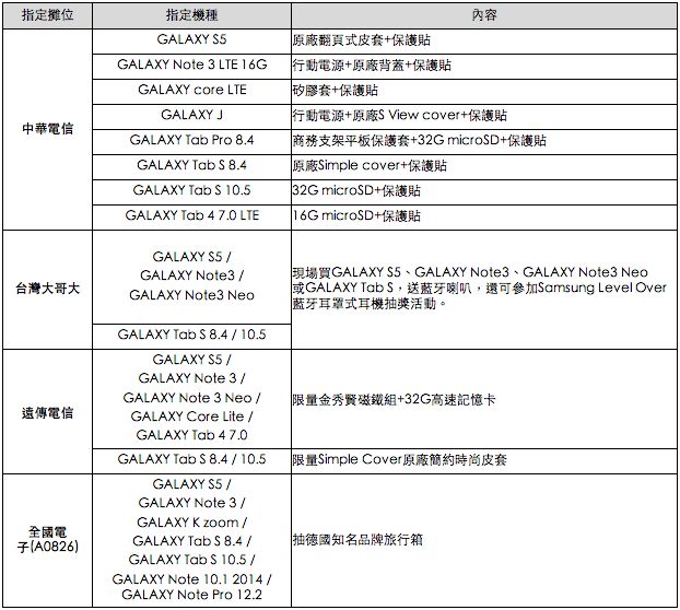 根據三星新聞稿指出,資策會調查顯示三星榮為台灣最普及的手機品牌,在台灣 4G 開台之際,台灣三星滿足各族群消費者需求,搶先全面佈局,推出橫跨高中低價格帶的全方位機種,包括 GALAXY S5、GALAXY Note 3 LTE、GALAXY J、GALAXY Note 3 Neo、GALAXY K zoom、GALAXY Core LTE、GALAXY Core Lite 等。而為了慶祝為三星成為台灣最受歡迎手機品牌,消費者只要於台北電腦應用展指定參展攤位購買三星手機、平板或相機不限機型就有機會擁有 Samsung GALAXY Tab S,其擁有領先業界的 WQXGA (2560×1600, 16:10) Super AMOLED 顯示螢幕,以及支援台灣 4G LTE 全頻段的強大功能。三星將於活動最後一天抽出五位幸運的消費者,有機會免費獲得 GALAXY Tab S 10.5 Wi-Fi 版璀璨金一台(建議售價 NT$15,900元),買得越多,機會越大!此外,各機種也將與不同的電信及通路夥伴合作,購機即享獨家好禮,讓消費者輕鬆啟動 4G 夏日新生活,隨時享受 4G 飆網新體驗!