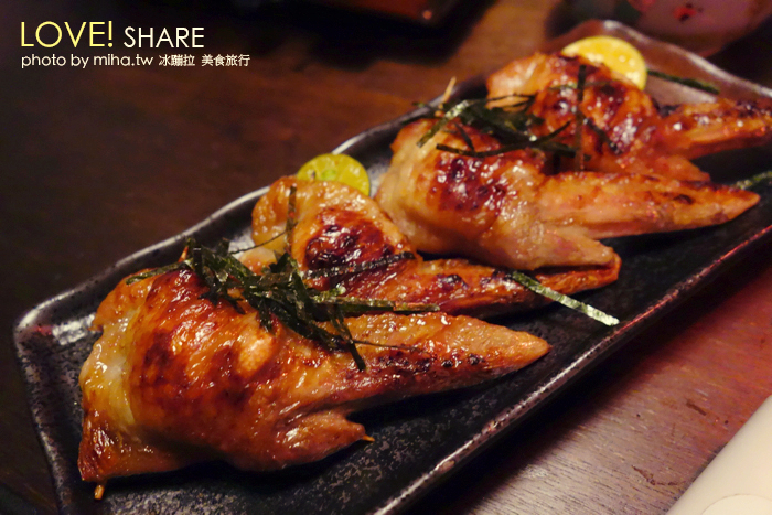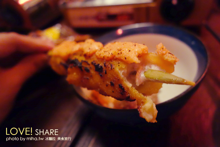 明太子雞翅($140/2串),雞翅烤的皮酥肉嫩塞滿明太子醬,有點鹹但下酒剛好,我喜歡。
