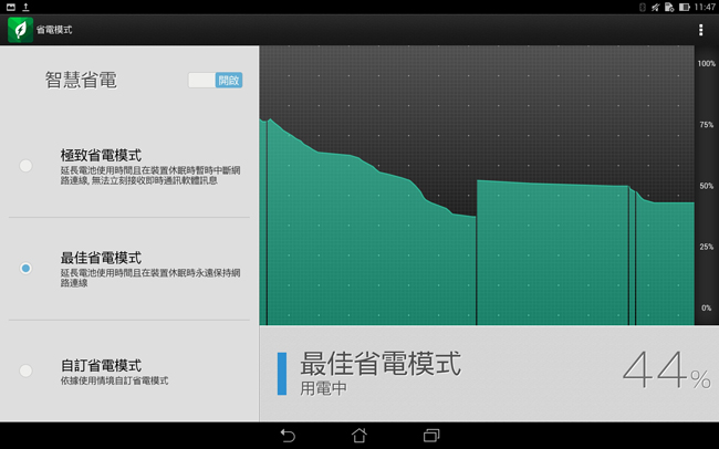 ASUS Transformer Pad TF303CL 還可以根據自己的使用習慣,軟體會做簡單的智慧省電設定,其中還分為極致、最佳、自訂的三種,在長時間使用平板的狀態下,有這樣貼心的設計還不錯。