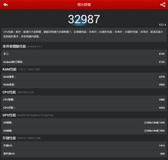 ASUS Transformer Pad TF303CL 透過安兔兔評測跑分,取得 32,987 分,在處理器、記憶體、2D/3D圖形性能上都有很好的表現。