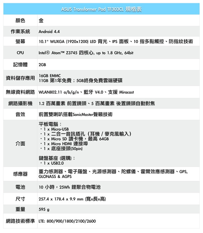 ASUS Transformer Pad TF303CL 是款 10 吋變形平板,硬體的重點在於搭載 Intel Atom Z3745 四核處理器、2GB 記憶體以及 16GB 儲存容量,並支援無線 WiFi + 4G LTE,在工作上提供了鍵盤底座使用模式的選擇,除了娛樂需求外也重視工作的生產力,從外型的設計上,很容易就會讓你想到是 ASUS 的 Transformer Pad。