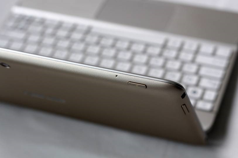 音量鍵在機身左後方,音量鍵同時也可以當做快門鍵,當我們雙手拿著平板拍照時,快門鍵的實體按鈕設計還滿重要的,不用一手拿平板一手按快門。另外音量鍵的上方是 Micro HDMI 連接埠,除了可以使用無線 Miracast 輸出外,還可以透過接線傳送畫面到螢幕或是投影機,如果只有VGA輸入的顯示設備,當然還可使用 micro HDMI to VGA 轉接線來輸出。