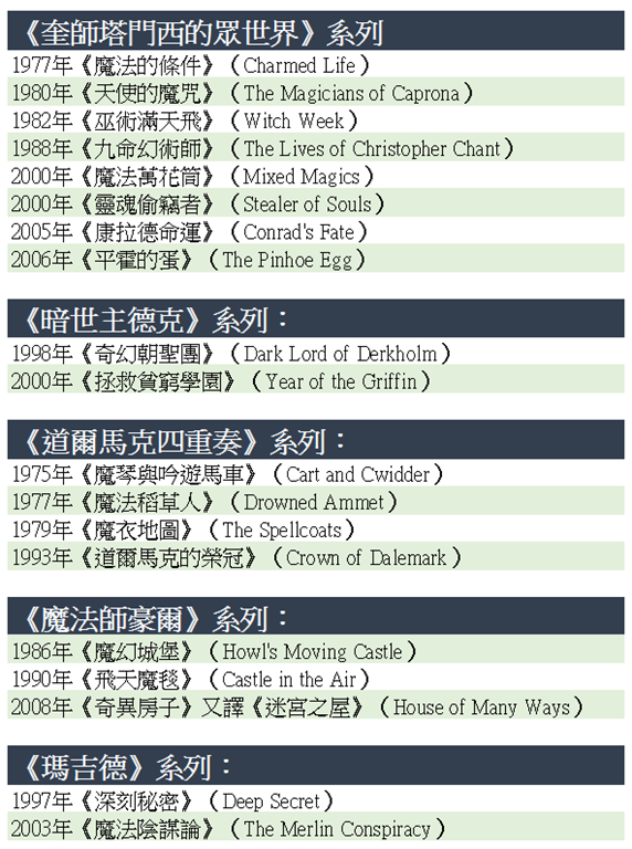 以下引用維基百科整理Diana Wynne Jones 的小說,有部分在台灣都有被翻譯成中文,大家也可搜尋看看。
