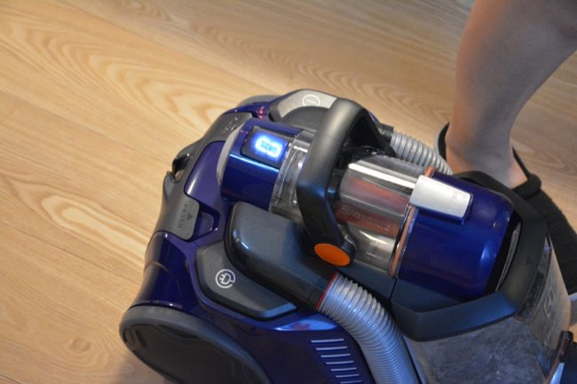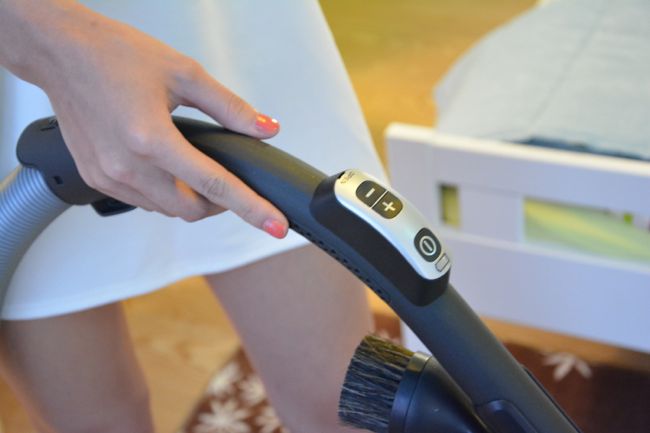 吸塵手把上同樣有設計開關按鈕與強度調節功能鍵, UltraFlex 頂級集塵盒吸塵器共設計有五種強度,在現場觀看示範,可以發現從1-5 的吸力雖然都有著明顯的不同,但大家最擔心的音量上卻是出乎意料的安靜,不過這部分未來若有機會評測,將會為各位帶來更多詳盡的介紹喲!