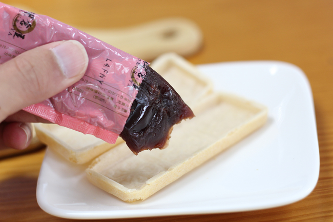 把這個綿密的紅豆沙餡料自己 DIY 加進去這個米香餅殼裡。