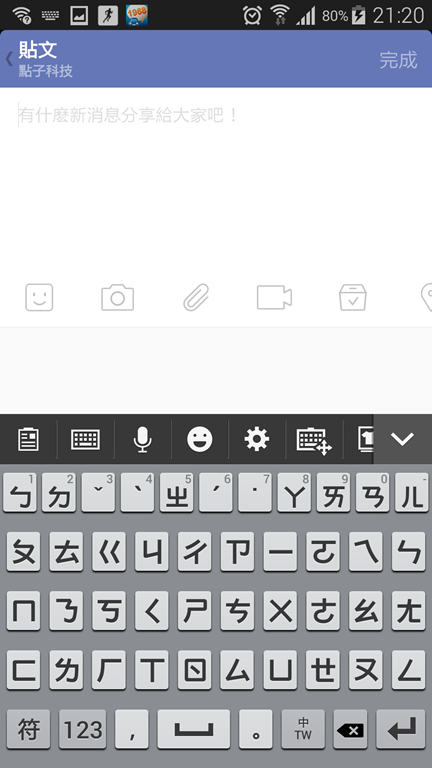 投稿貼文時,除了上方文字框可以用文字撰寫外,還可以加入表情符號、照片、影片與其他文件作為附件。