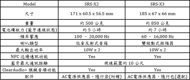 Sony SRS-X3(紅/黑/白)建議售價NT$4,590元,Sony SRS-X3 隨行包(紅/灰)建議售價NT$690元,將於8月5日正式在台販售。SRS-X2(紅/黑/白) 即將上市,建議售價NT$2,990元。更多詳細產品訊息請洽全省Sony直營通路,Sony 台北(101)直營店、Sony台北(復興)直營店、台北(西門)直營店、Sony 台中直營店、Sony 高雄直營店、Sony 官方購物網站 【 www.sony.com.tw/store/ 】、Sony客服中心(電話:4499111) 以及各大通路選購。