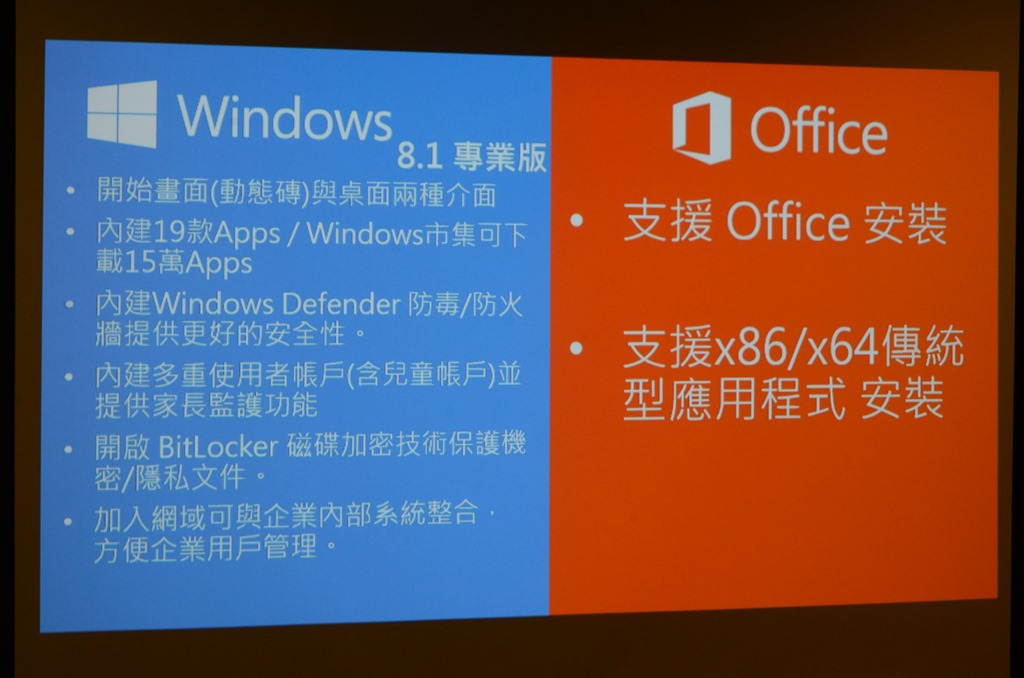 軟體部分則搭載最新的Windows 8.1 專業版,內建Windows Defender,具有防毒與防火牆功能,更能保護筆電的安全;當然Windows 8.1專業版的BitLocker、多重使用者帳戶與加入網域可與企業內部系統整合的功能,更適合公司商務使用。當然X86架構,可安裝X86與X64的傳統應用程式,也可下載安裝市集中的APP,更為靈活方便。