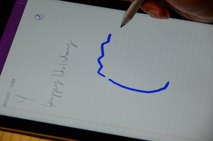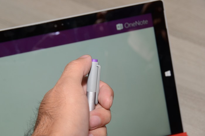 Surface Pro 3這次所搭配的Surface手寫筆為N-Trig技術,具有256階感壓能力,可提供順暢的筆記書寫與簡單的繪圖。書寫與繪圖時可將手放在面板上而不至於誤觸,讓書寫更為自然順暢。