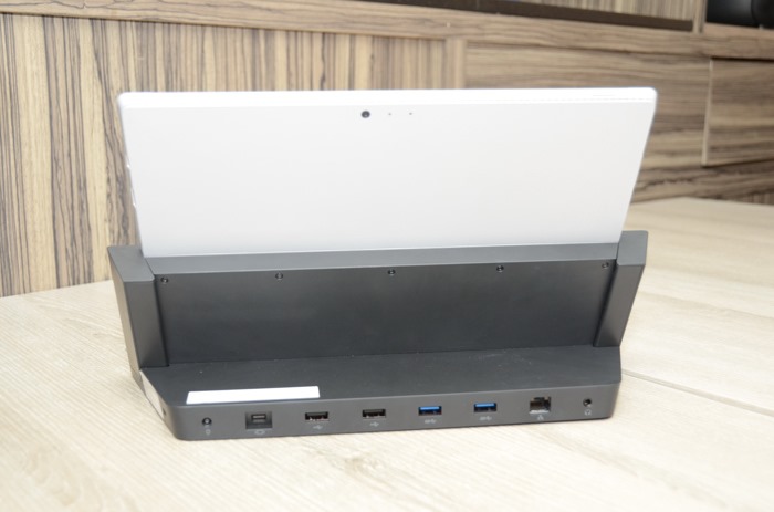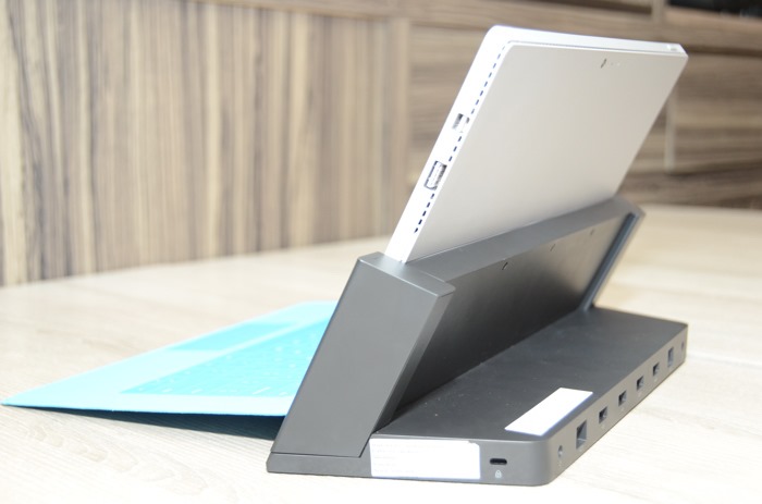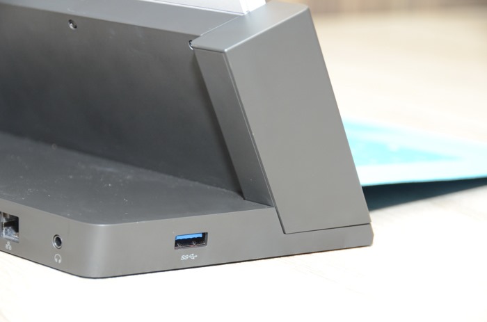 擴充基座具有Mini DisplayPort、兩組USB 2.0、三組USB 3.0、網路連接埠、音源輸出,當然放上後就可利用基座進行充電。