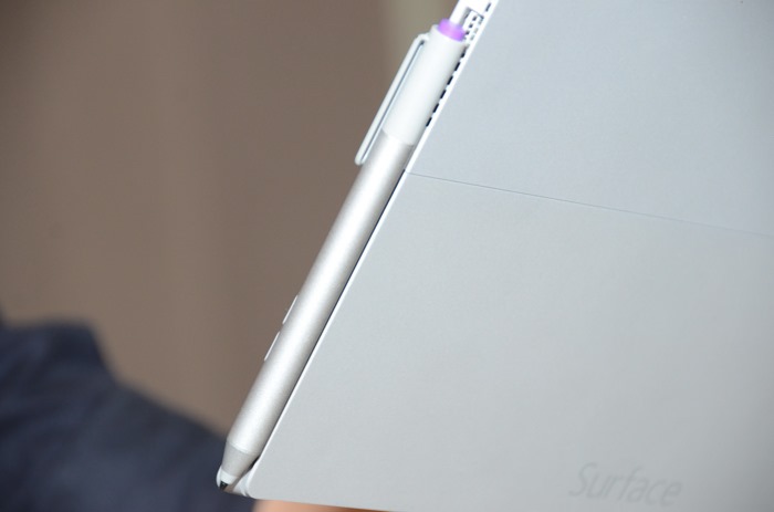 Surface手寫筆還可以磁力附著在機身上,若筆記到一半想用鍵盤操作時,可把筆暫時放在機身上,就不會沒地方放了。