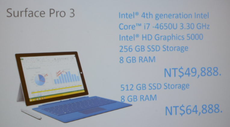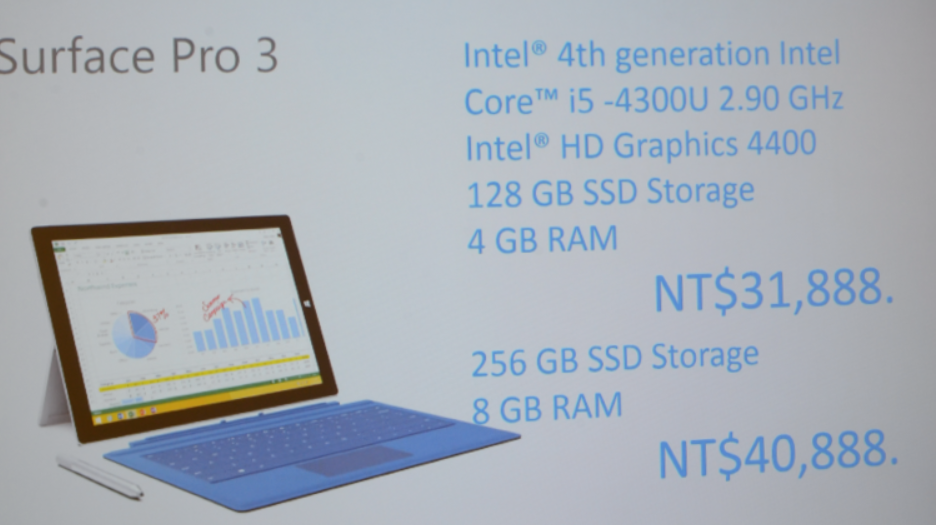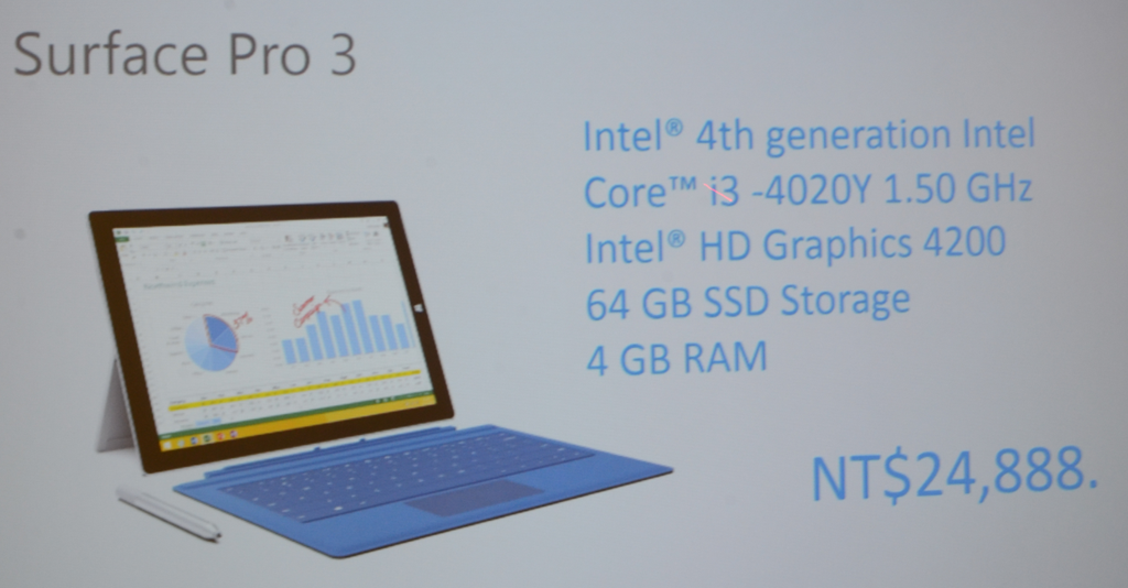 在技術規格部分,Surface Pro 3推出多種組合來提供消費者選購,包含售價NT$24,888基本款的i3-4020Y(1.5 GHz)、4GB RAM、64GB ROM、Intel HD Graphics 4200顯卡。