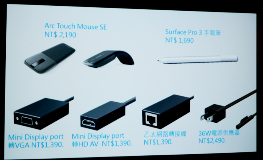 而周邊部分包含Arc Touch Mouse SE、Surface Pro 3手寫筆(購買Surface Pro 3 隨機即附贈N-Trig手寫筆)、Mini DisplayPort轉VGA線、Mini DisplayPort轉HDMI線、RJ45網路轉接線與36W電源供應器,都已經準備好可讓消費者依需求選購。