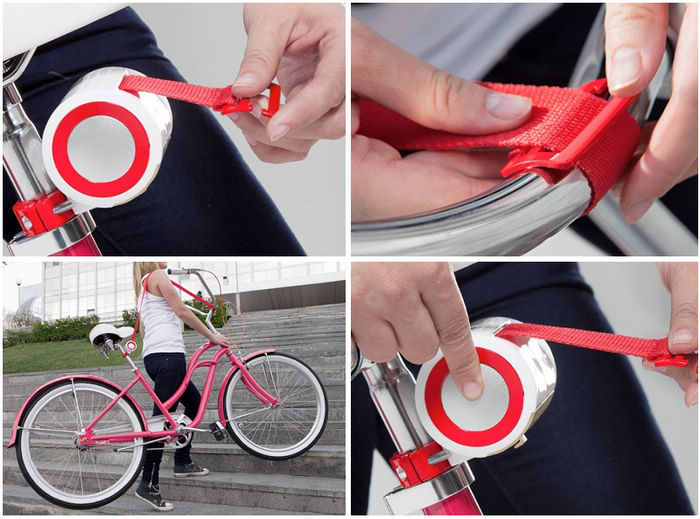 Bike Lift&Carry 外形就像一個捲尺,安裝在腳踏車座椅下的支桿,方向朝前,使用時將其帶子拉出,將扣環扣住車頭,形成一條揹帶,長短可依個人調整,讓用戶用肩揹負重把腳踏車揹扛起來,Bike Lift&Carry 自行車肩帶有鋼材結構,能承受達31公斤。