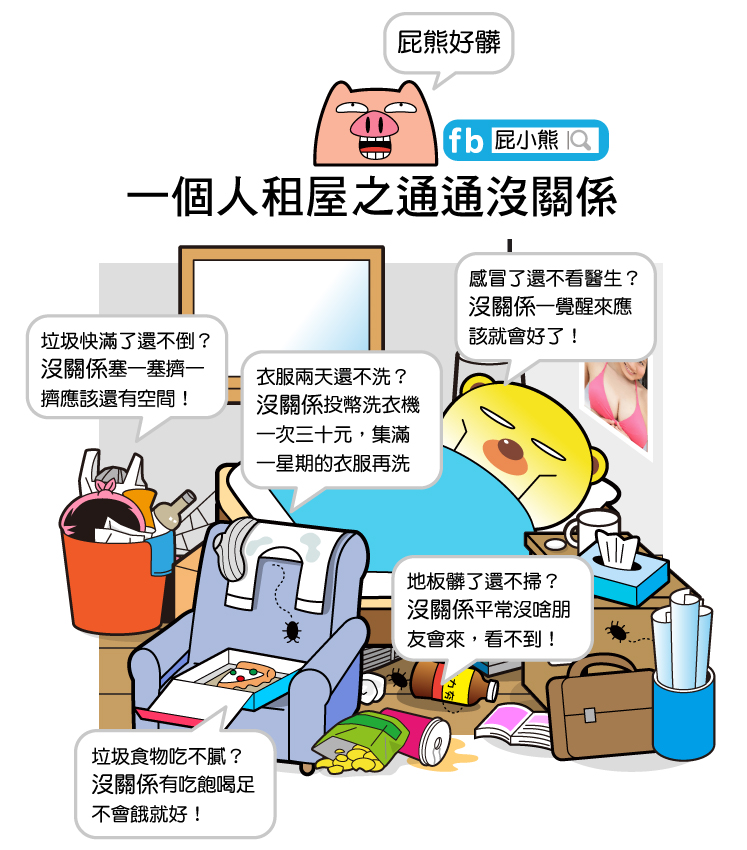 以上都是屁熊自己走過的路…最想說的是小時候在家裡爸媽幫你照顧好,什麼事都有他們頂著做,一早起來你有健康滿點的早餐,是媽媽一大早就起來準備的,家裡環境乾乾淨淨是爸媽三不五時就拿掃把抹布整理的,一點小感冒就緊張的帶你去診所看醫生,衣服也是每天白淨飄香。屁熊真的很不會照顧自己~一直沒有珍惜,只想一個人外出看看這個世界,結果卻連最簡單的生活起居都做的二二六六~真該打屁股了~這漫畫雖然搞笑演出,但也是想跟大家分享的是…出門在外真的要學會照顧自己,而不是什麼事情都「沒關係」啊~~
