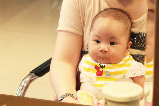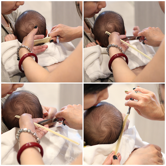 媽媽加上理髮師一搭一唱,小恰咪很快就進入狀況,至少也比較有安定信賴感了。話說當時睡也睡飽了,喝也喝飽了,大便也大完了,正好是心情好的時候,這個時候剪頭髮剛剛好!