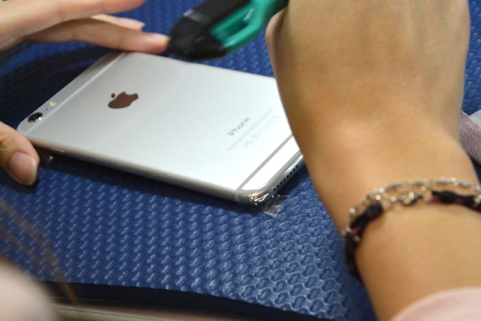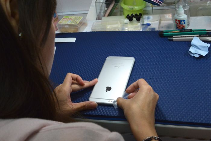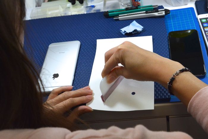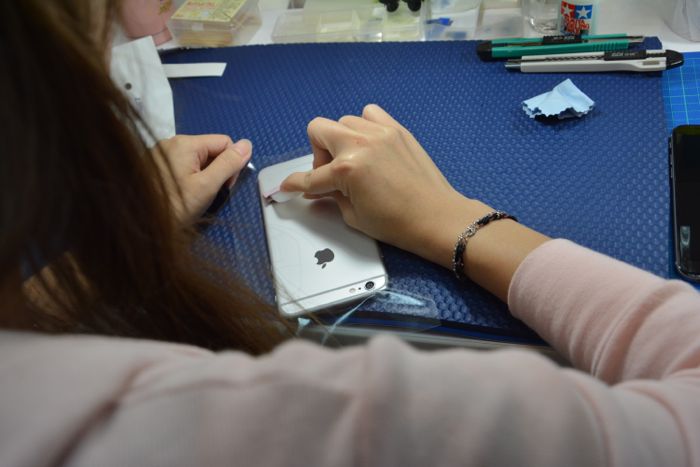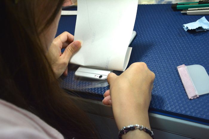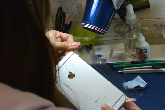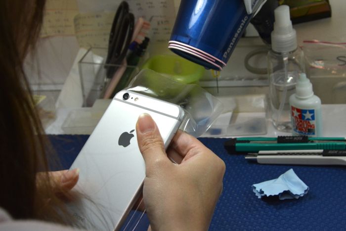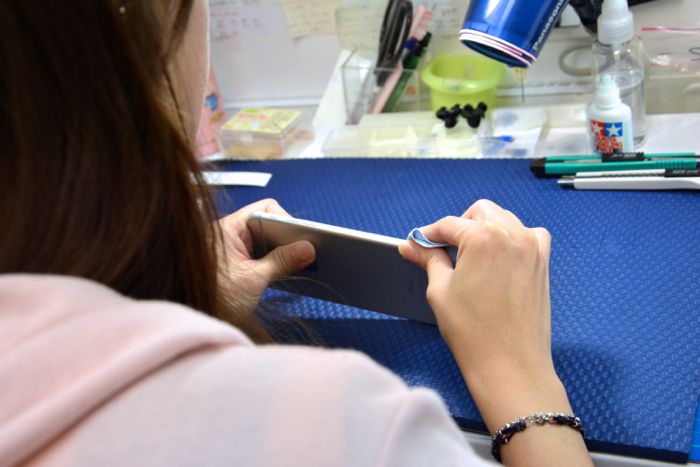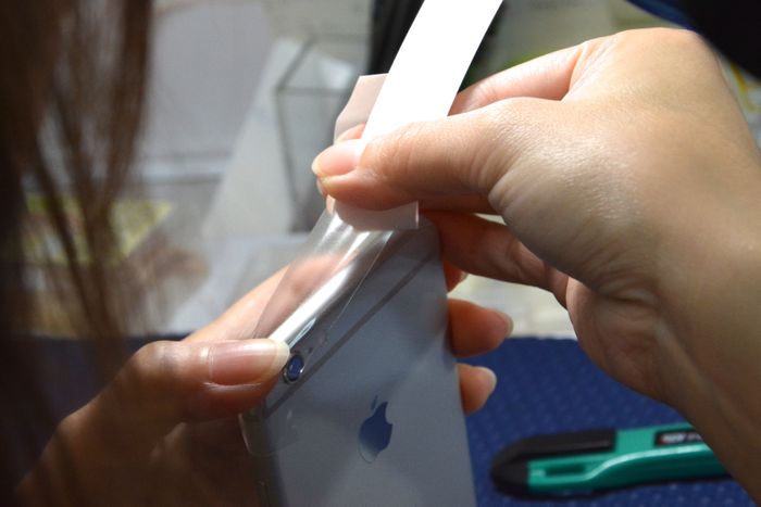 在準備開始包膜時,師父會先小心翼翼地將機身全部擦拭過並且檢查一遍。如果機身本身有瑕疵,也會在這時候與客人進行溝通,避免日後不必要的誤會。