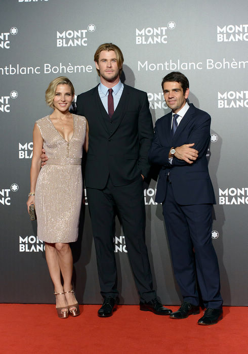 (左起)西班牙女星Elsa Pataky、好萊塢巨星克里斯漢斯沃Chris Hemsworth與萬寶龍全球執行長傑羅姆‧蘭伯特Jérôme Lambert