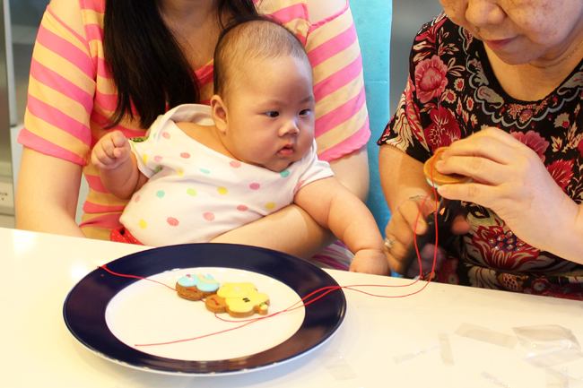 人家傳統說「做四月日」也就是「收涎」,就是在小朋友滿 4 個月的那天的一個傳統禮俗。顧名思義就是要收起寶寶的口水,掛一串餅乾在身上,然後長輩拿著餅乾做擦口水的動作,講一些吉祥話。