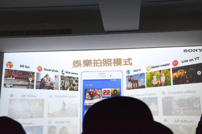 在這場說明會中,Sony 針對 Z3/Z3 Compact 的新功能來作加強介紹。首先強調相機部分多了三個最新的功能:低光源拍攝、新一代錄影防手震、更寬廣的拍照視角。