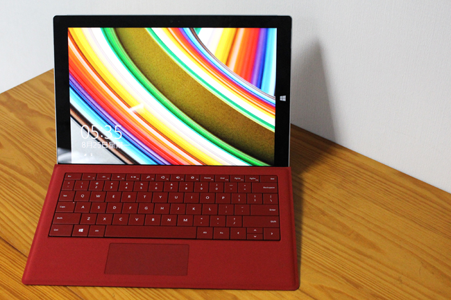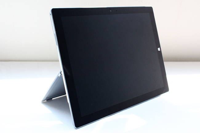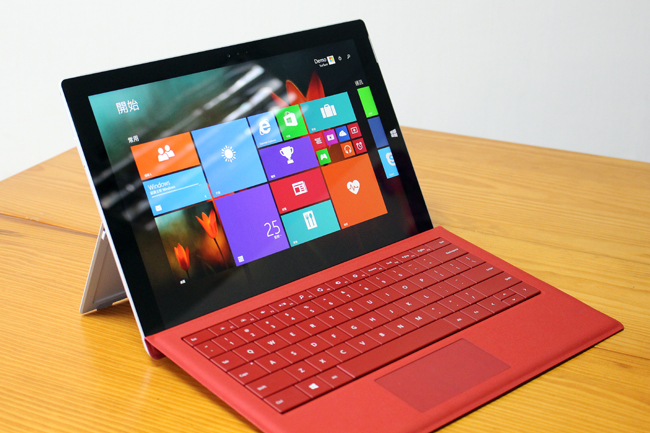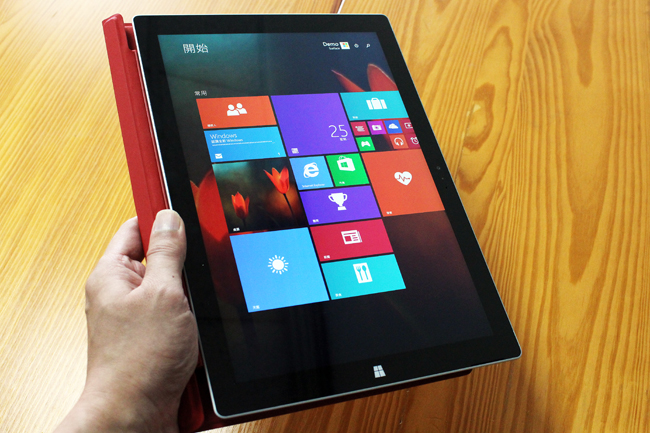 Surface Pro 3 立起來的正面就像這樣,有不錯的視角,這次螢幕從上一代的 10.6 吋躍升到 12 吋,而且有 2,160 x 1,440 的 2K 超高解析度,不管是當平板或筆電都很舒服!