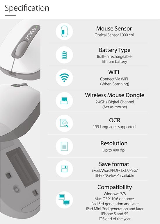 小形又靈活的Zcan Wireless 無線掃瞄滑鼠方便用來掃瞄較小紙張又零碎的資料或是單據,例如收據、食譜、圖片,把零碎的資料有系統的保存與建檔;Zcan Wireless也提供Evernote供用戶記錄筆記、文件等文書資料,及社群網路分享圖片功能,用戶可將正在繪製的圖像掃瞄上傳至Facebook、Twitter、Flickr與親友分享。