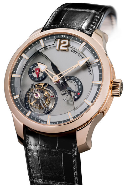 直徑43.5mm,5N紅金錶殼/ GF01c機芯,安裝菲利普末端曲線游絲的變量慣性擺輪,每小時振頻21,600次(3赫茲),動力儲存72小時/搭載24秒陀飛輪系列,一個高效以24秒快速旋轉丶傾斜 25 度的陀飛輪框架,有效地減少地心吸力對振盪器造成的負面影響,特別在穩定位置時更見其良好表現/圓弧形藍寶石水晶鏡面,背面為扁平底蓋/手工縫製黑色鱷魚皮錶帶搭配5N紅金折疊扣