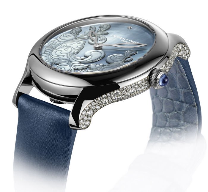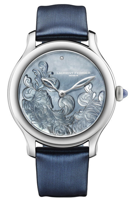 直徑40mm,210 Pd 18K未鍍銠白金錶殼/ FBN 229.01型單向棘爪式微型擺陀自動上鏈機芯,每小時振頻21,600次(3赫茲),動力儲存72小時,微型擺陀,雙正向脈衝矽制輔助擒縱裝置/小時、分鐘顯示/塔希提藍色珍珠貝母錶盤,12時處設置有明亮型切割鑽石時標,18K/750金鏤空葉片形指針/圓弧形藍寶石水晶鏡面/內襯短吻鱷皮的緞質錶帶搭配18K/750白金扣針式錶扣/防水30米