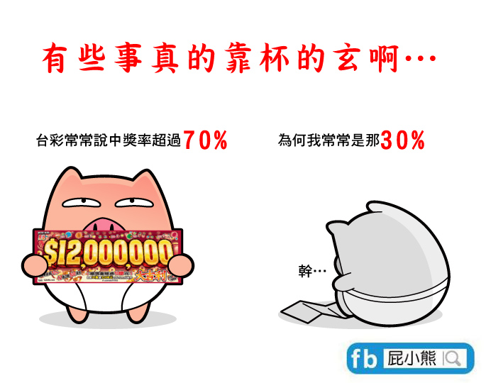 屁小熊 2014/10/30瀏覽: views 每到過年我就會遇到這麼雖小的事啊~~~~不知朋友們你們是否也遇到這樣~~~明明好事的機率高很多,但自己偏偏就是比較慘的那個低機率的…而且還常常啊! 想起過年都會想要賭一把~~台彩總是會出面額一張一千元的高獎金高中獎率的刮刮樂來應景~~說好的高中獎率~雖然最低可能會中五百(虧一半)但虧一半我也認了!去年連兩張是都30%的沒中獎是怎麼回事啦~~~~~~二千元連個蛋都沒有…有夠慘的~~~希望明年不會這樣了… 由屁小熊的小冊日記貼文。 Related Items上班族搞笑漫畫刮刮樂屁熊內褲豬 好有趣 2014/10/30瀏覽: views 屁小熊 愛分享上班搞笑的屁熊還有內褲豬,職場不開心的話就快來找我們 ■作者:屁小熊 ■主題:職場、漫畫、生活、搞笑 ■個人網站:https://padbear68ee07.blogspot.com/ ■FB粉絲團:https://www.facebook.com/ppbear123 ■連絡方式:197968ee07@gmail.com Related Items上班族搞笑漫畫刮刮樂屁熊內褲豬 next page