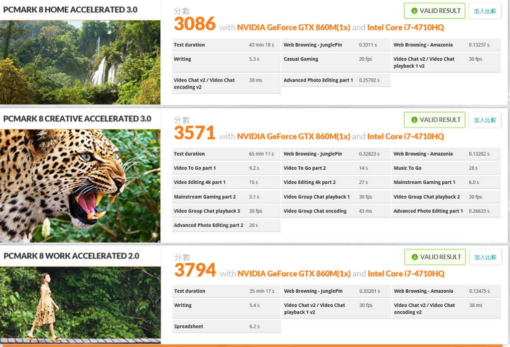 在PCMARK Basic版本上,Home模式得到3086分、Creative模式為3571分、Work模式則為3794分,表現上都相當不錯。尤其在影像處理部分,更有非常優異的表現,NVIDIA GeForce GTX 860M顯示卡的確提供非常強大的支援。