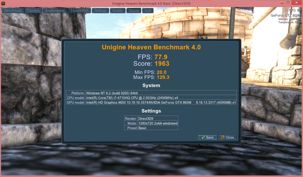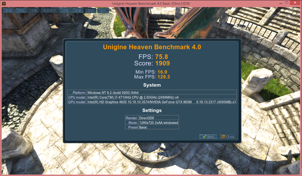 最後Unigine Heaven Benchmark 4.0分別以BASIC與EXTRME來進行測試,分別拿下FPS 77.9 / 1963分 與 FPS 75.8 / 1909分的成績,成績也在一般電競筆電的平均之上。