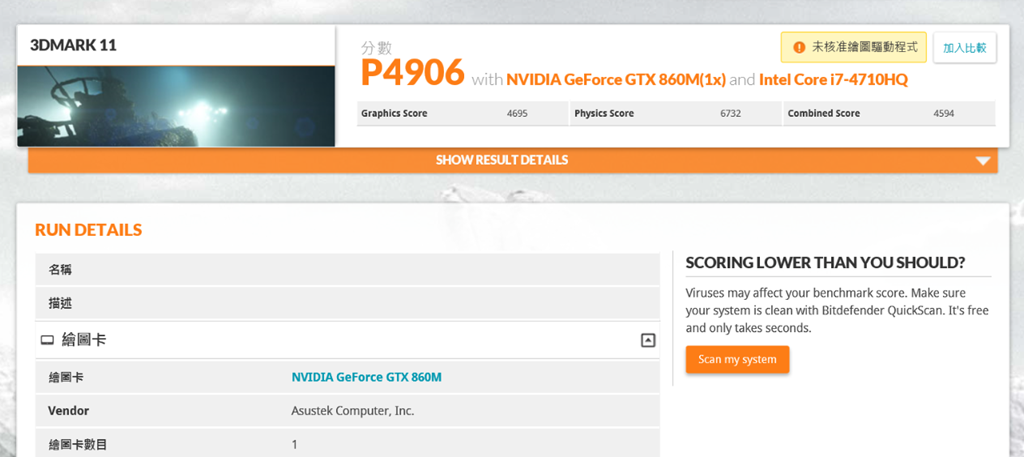 在3DMARK 11版本測試中拿到P4906的高分,在整體表現上,比一般電競筆電要優異許多,第4代Intel Core i7-4710HQ處理器與NVIDIA GeForce GTX 860M 4GB顯示卡讓G551JM有很棒的表現。