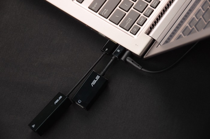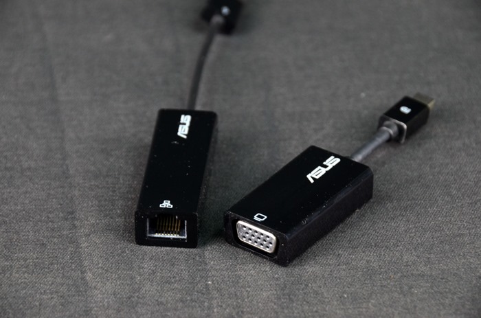 在UX303的標準配件中,還包含RJ45轉接線與VGA轉接線。RJ45轉接線可以讓你直接插入網路線使用,另一段只要接上USB Port即可;而VGA轉接線另一頭是以mini DP為訊號源,轉接後可支援舊型的投影機或是螢幕使用。