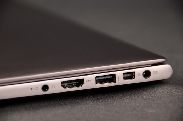 一般輕薄型筆電大多都無法配置太多I/O孔位,但UX303除了具備3個USB外(1個USB 3.0、2個USB 2.0),還有標準HDMI、mini DP、3.5mm耳機孔、還有SD卡插槽,全部都配置在機身兩側。