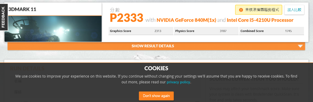 在處理效能上,使用3DMARK 11的跑分,得分為P2333,對於商務處理絕對不會有問題,當然遊戲部分有了NVIDIA GeForce GT 840M (2G DDR3)的協助下,也可有順暢的表現。
