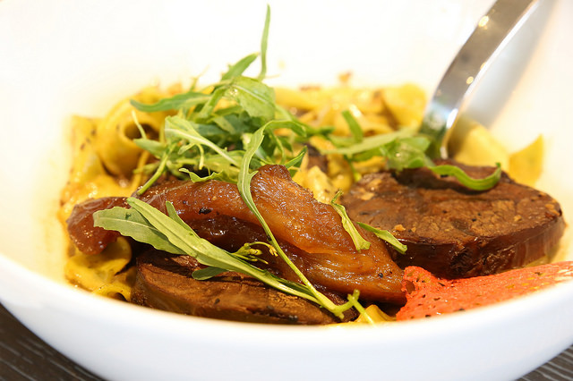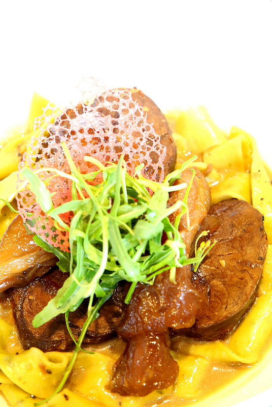 必點招牌【黑松露麵】,綠色寬麵可是自製的唷~用宜蘭三星蔥榨汁拌入麵粉,吃得到職人的用心。