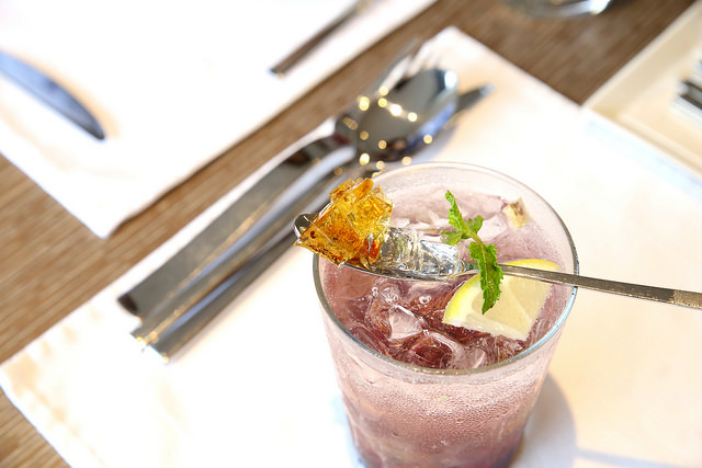 來杯【黃金莓果蘇打】休息一下,把綜合果莓、陳年紅酒醋熬到濃稠,再加入自家販售的德國花草茶,畫龍點睛的是切成小塊狀的【黃金糖】,吃起來Q彈有嚼勁,伴隨著優雅的桂花香氣和蜂蜜甜感,自然又健康,我個人非常喜歡。
