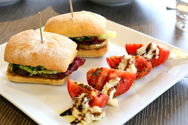 吃到這裡,我忍不住問主廚說,裝飾用的那個網狀物體是怎麼做的?他說就是用麵粉和著水,煎的時候產生泡泡,就變成這個樣子。接下來的這道【蜜蘋果醬燒豬肉拖鞋三明治】,很洋派的名字吧?主廚說:「這是刈包的概念,只是我們嘗試過加花生粉,但味道有點衝突,但是還是有香菜在裡面。」可惜今天人太多,得要切開分著吃,不然大叔真的很想直接抓起來狠狠咬上一大口!