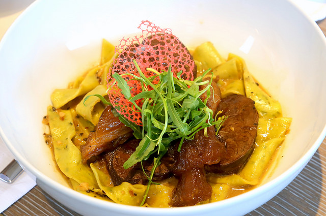 雖然是秀色可餐,但我們還是得吃點可以填飽肚子的東西,先來看這道非常非常犯規的【采采牛筋牛肉麵】!宗山主廚說:「其實就是我們台灣的牛肉麵,但是我做了點變化,加些動物性鮮奶油、黑松露,讓它有中西合併的氛圍。」這牛肉、這牛筋真的很入味,搭配寬麵在一起,大叔的好鄰居劉永華這個山東老鄉來吃都會流淚啊!
