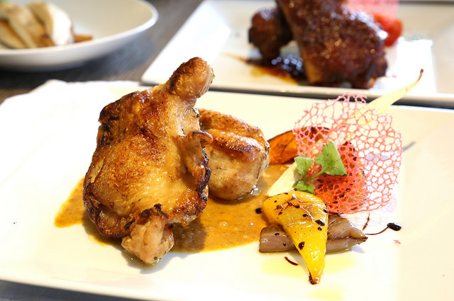 先是牛肉又是龍蝦,一旁的烤雞稍微有被冷落,其實它是今天第二好吃的【焦糖鳳梨烤雞佐叻沙醬】,它的外皮烤到酥酥脆,切起來會喀滋喀滋的,裡面的雞肉卻是嫩到一咬就化,跟充滿南洋風情的叻沙醬一起吃,爽口不膩!