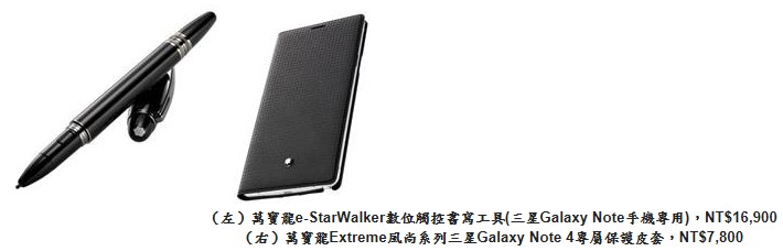 在頂級書寫工具與皮件界佔有一席之地的萬寶龍宣布與全球行動裝置領導品牌三星公司聯手合作,推出Galaxy Note 4系列專屬配件,此次合作系列所涵蓋的多種配件商品與Galaxy Note 4相互輝映。Galaxy Note系列提供使用者獨特、先進的行動裝置使用體驗,為此萬寶龍特別推出有史以來首款e-StarWalker與Pix數位觸控書寫工具,以萬寶龍在頂級書寫方面百年傳承以及獨特的技術,結合三星於數位書寫的領先技術,可說是相得益彰。