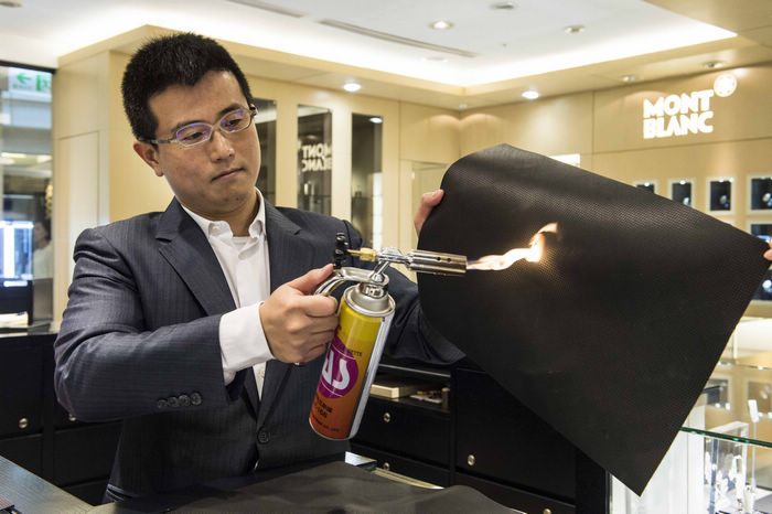 萬寶龍此款創新高性能皮革具備抗磨損、防水與耐高溫的三大特色,以隔絕外在環境的損害。Extreme特殊皮料為生活耐高溫 實驗僅供示意 消費者請勿模仿