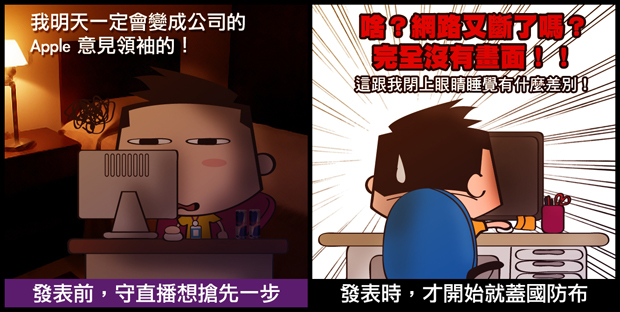 可能是這次看的人比較少了,上回看 iPhone 6 的發表,現場直播簡直是蓋著國防布在看,今天明顯就順多了,難道是因為沒梗嗎?