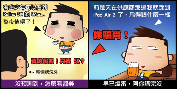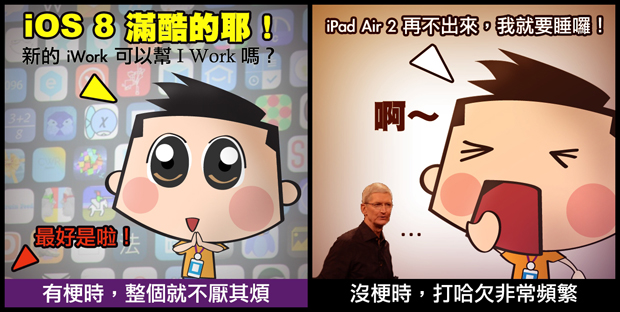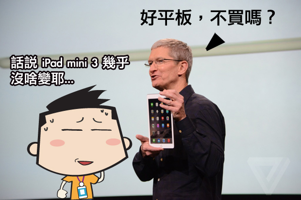 好啦!不要亂畫了,這次全新的 iPad Air 2 和 iPad mini 3 或許沒有改變太多,但其實仔細看相關的軟體開發設計,你會發現 Apple 其實下了很多苦工,很期待未來的軟體整合能力,電腦方面發表了新的 iMac 以及 Mac mini,個人覺得跟我一樣負擔不起 iMac 的朋友(誰跟你一樣啊),又想使用方便的 Mac OS,新款的 Mac mini 是個便宜實惠的選擇,搭個螢幕就好啦!如果手邊的 iPad 還好好的話,沒有要弄什麼超強功能,其實可以繼續用啦…